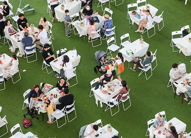 현장에서 구매하거나 가져온 맛있는 음식을 푸른 잔디 위에 차려진 테이블에 멋지게 차려놓고 신나는 공연과 함께 파티를 즐기듯 맛있는 시간을 보낼 수 있는 공간입니다.